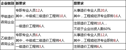 2.申请甲级资质,一级造价工程师人数要求由10人降低为6人,需要专职从事工程造价专业工作的人员由20人降低为12人。