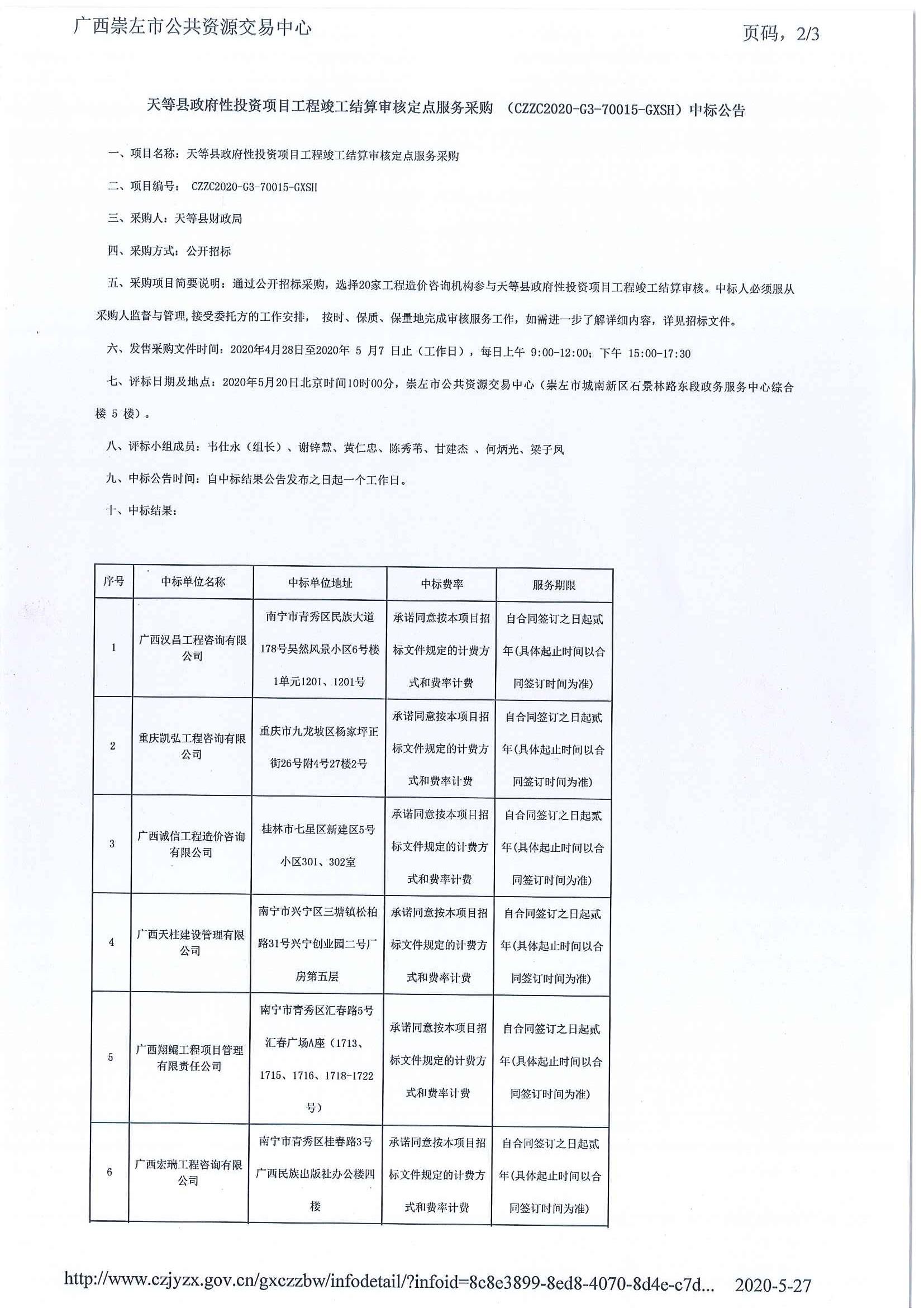 与此同时,在天等县财政局公开招标的天等县政府性投资项目工程竣工结算审核服务中,汉昌咨询脱颖而出也顺利中标天等县政府性投资项目工程竣工结算审核项目,这意味着汉昌咨询在政府投资项目中也发挥着举足轻重的作用并不断被认可的。